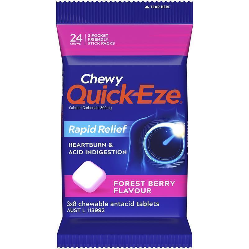 Chewy QUICK-EZE Forest Berry Flavour antacid tablets help provide rapid relief from heartburn and acid indigestion by neutralizing stomach acid fast. Proudly made in Australia, Chewy QUICK-EZE Forest Berry Flavour antacid tablets contain active ingredient Calcium Carbonate, and no artificial colours. Each pack contains 24 tablets, conveniently packed in 3 sticks of 8, perfect to take on-the-go.
