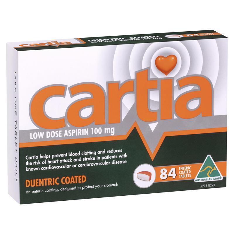 Low dose aspirin helps reduce blood stickiness and the risk of blood clotting. CARTIA is beneficial for preventing heart attacks and strokes in patients with known cardiovascular or cerebrovascular diseases. For use under medical supervision only. Discuss with your doctor before changing any medications. Do not use in children under 18 years of age unless advised by your doctor.