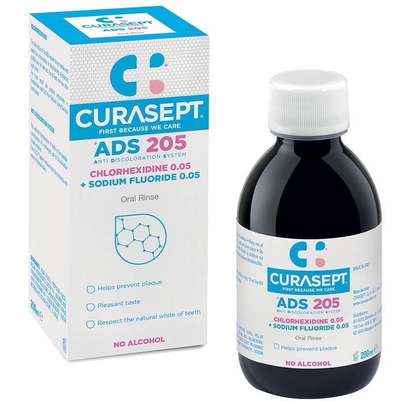 • Do not swallow – For external use only – Keep out of reach of children. • Store in a cool, dark place. • Do not use CURASEPT oral rinse with fluoride in children six years of age or less. • It contains Sodium Metabisulfite and Sodium Fluoride.
