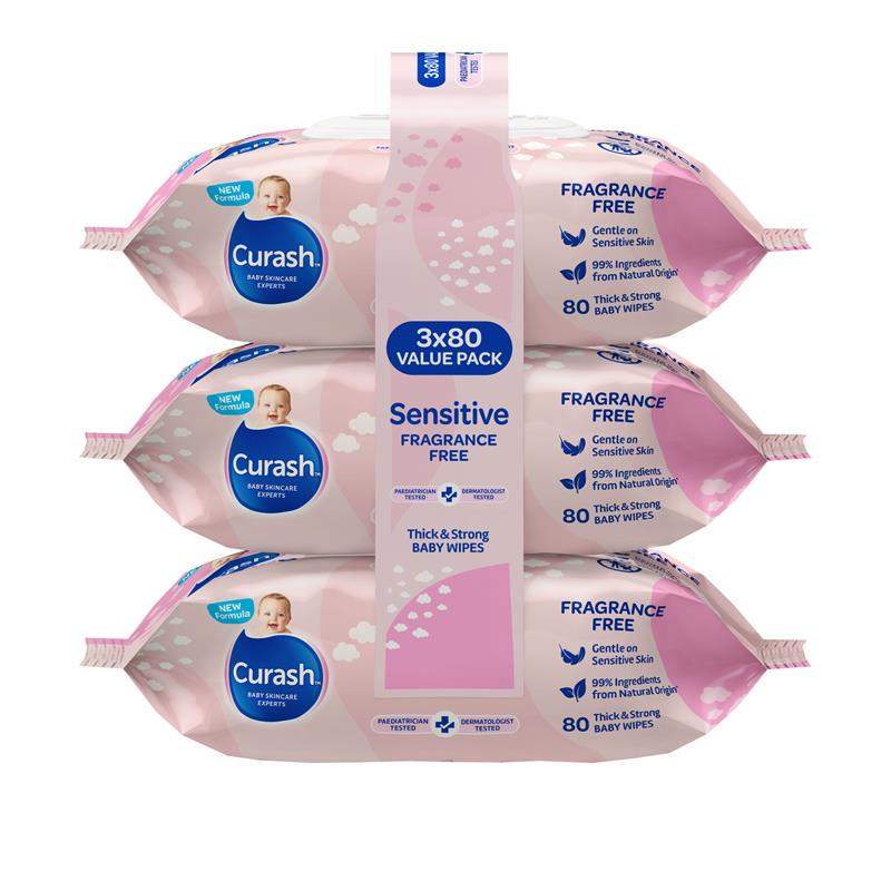 New Formula Curash Sensitive Fragrance Free Baby Wipes have been specially formulated to be gentle on baby's sensitive skin.