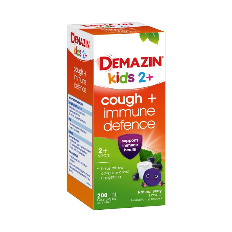 DEMAZIN Kids 2+ Cough + Immune Defence Syrup helps relieve coughs & chest congestion while also supporting immune health.