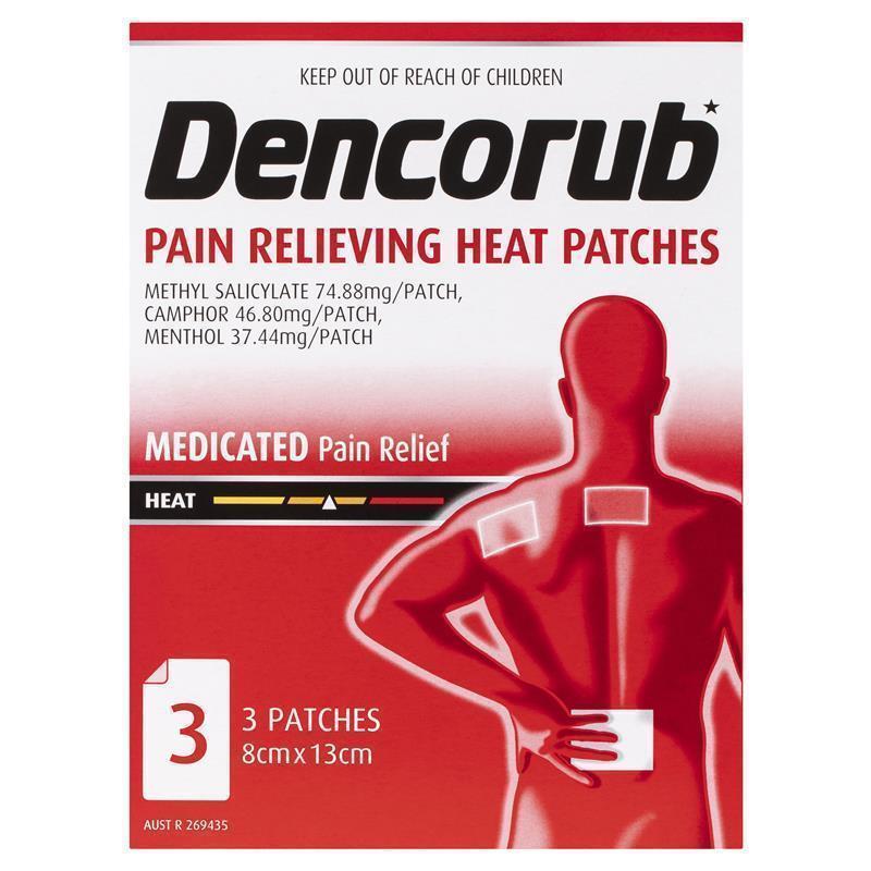 Dencorub Pain Relieving Heat Patches provide temporary relief of minor aches and pains of muscles and joints associated with backache (lumbago), sprains, and strains.