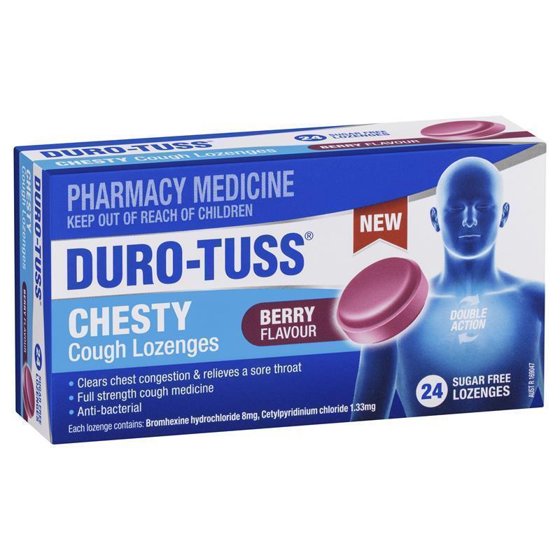 Duro-Tuss Chesty Cough Lozenges Berry clears chest congestion & relieves a sore throat, full-strength cough medicine and anti-bacterial.