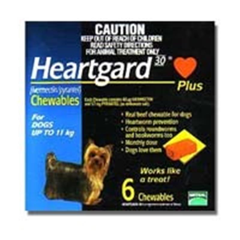 Heartgard (Ivermectin) is given once a month year round for the prevention of heartworm disease. The usual dose of ivermectin in dogs up to 11 kg is 68mcg; for 12-22kg is 136mcg; for 23 to 45 kg is 272mcg. Dogs over 45 kg are given a combination of the chewables.