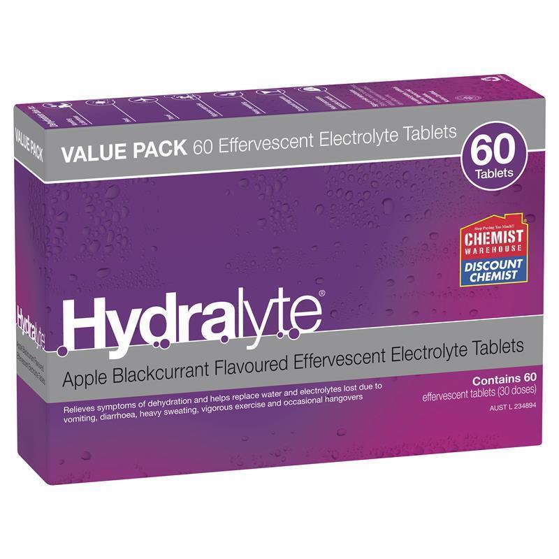 Hydralyte Effervescent Electrolyte Tablets Apple Blackcurrant Flavoured relieves symptoms of dehydration and helps replace water and electrolytes lost due to vomiting, diarrhoea, heavy sweating, vigorous exercise and occasional hangovers.