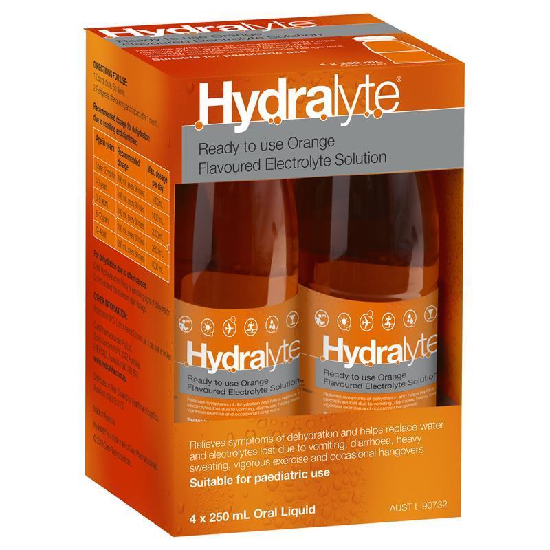 Hydralyte Ready to use Electrolyte Solution Orange Flavoured relieves symptoms of dehydration and helps replace water and electrolytes lost due to vomiting, diarrhoea, heavy sweating, vigorous exercises and occasional hangovers.