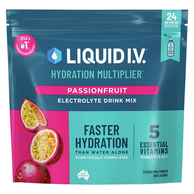 Liquid I.V.® Hydration Multiplier Passionfruit Electrolyte Drink Mix helps restore electrolyte imbalance that occurs through performance, heat/sun, travel, and adventure.