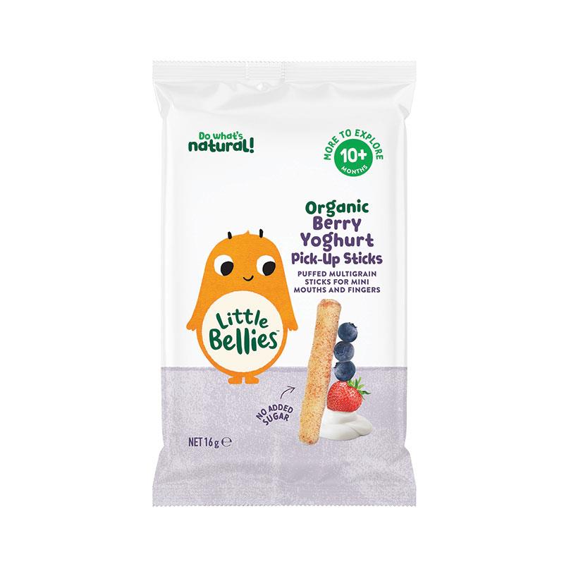 Little Bellies Organic Berry Yoghurt Pick-Up Sticks are puffed multigrain sticks made specifically for infants.