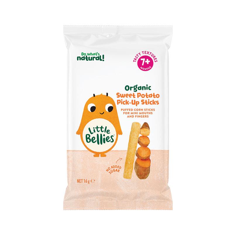 Little Bellies Organic Sweet Potato Pick-Up Sticks are soft melt-in-the-mouth sticks made of puffed corn and sweet potato, designed for tiny hands to encourage safe self-feeding.