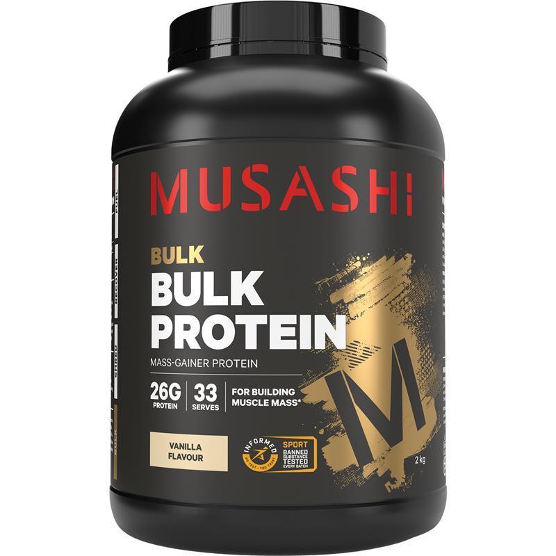 Musashi Bulk Protein Blend (70%) [Whey Protein Concentrate, Skim Milk Powder, Whole Milk Powder, Whey Protein Isolate, Emulsifiers (Soy Lecithin, Sunflower Lecithin)], Maltodextrin, Dextrose, Vitamins & Minerals (Di-calcium Phosphate, Dipotassium Phosphate, Magnesium Carbonate, Zinc Gluconate, Ferric Pyrophosphate, Maltodextrin, Sodium Ascorbate, Vitamin E Acetate, Nicotinamide, Vitamin A Acetate, Vitamin D3, Vitamin B12, Potassium Iodide, Vitamin B6, Vitamin B2, Vitamin B1, Folic Acid), Flavours, Vegetable Gum (Guar Gum), Sweetener (Sucralose), Acidity Regulator (Citric Acid).