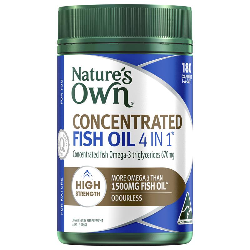 Product Claims: Nature's Own Concentrated Fish Oil 4 in 1 supports heart and eye health, cognitive function, and general wellbeing.
