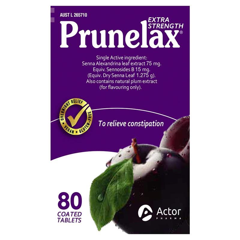 Product Claims: Prunelax is an effective laxative made of naturally derived senna. For predictable relief, take Prunelax. Contains 15mg of Sennosides B per tablet. The Extra Strength formulation means that patients don't have to take as many tablets.