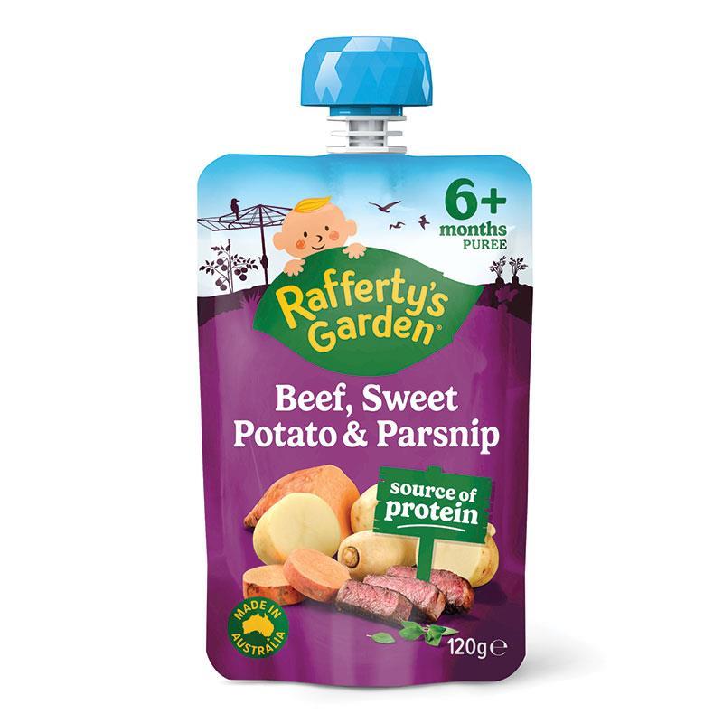 Rafferty's Garden Beef, Sweet Potato & Parsnip pouch is a tasty meal option when you’re ready to introduce your little one to protein. With tasty beef and veggies, this puree is a source of protein and has no artificial colours or flavours, and no added salt or sugar. Suitable for babies from 6 months and upwards.