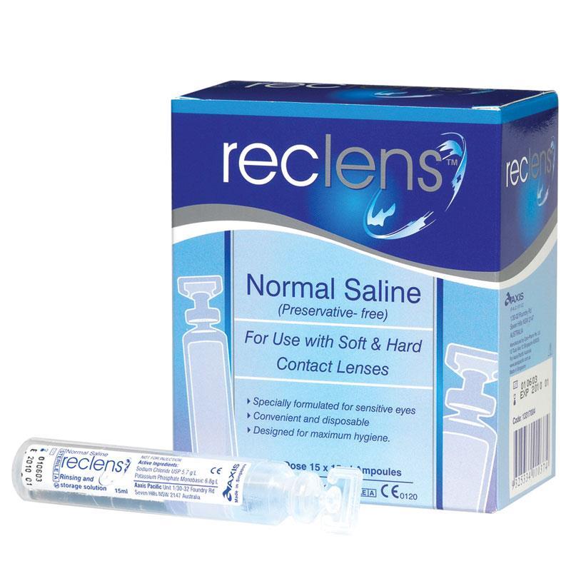 Reclens normal saline is a rinsing and storage solution for contact lens care.
