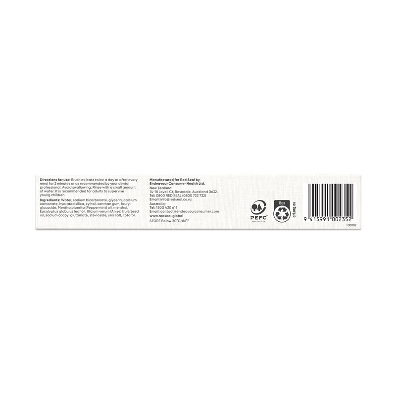 xylitol, xanthan gum, lauryl glucoside, Mentha piperita (Peppermint) oil, menthol, Eucalyptus globulus leaf oil, Illicium verum (Anise) fruit/seed oil, sodium cocoyl glutamate, stevioside, sea salt, Totarol.