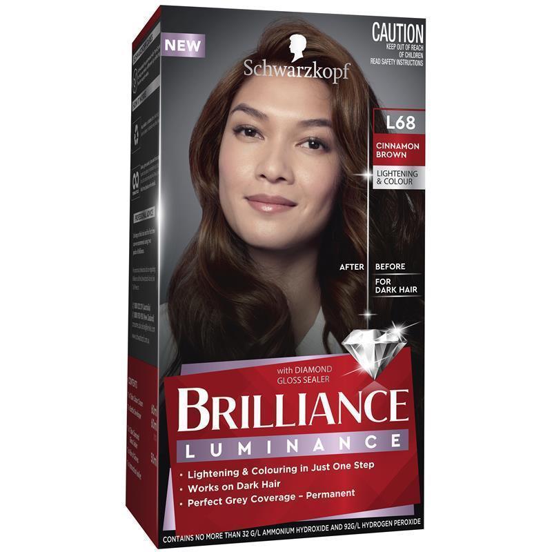 Schwarzkopf Brilliance Luminance L68 Cinnamon Brown provides lightening and colouring in just one step for fashionable colour, even on dark hair.
