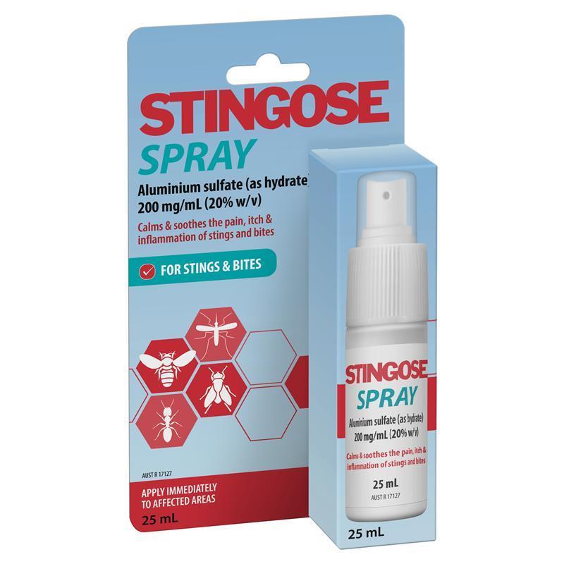 Stingose Spray helps to minimise the pain, inflammation, and itching associated with stings and bites of most insects and plants, including ants, bees, wasps, mosquitoes, sandflies, sea lice, vines, and nettles.