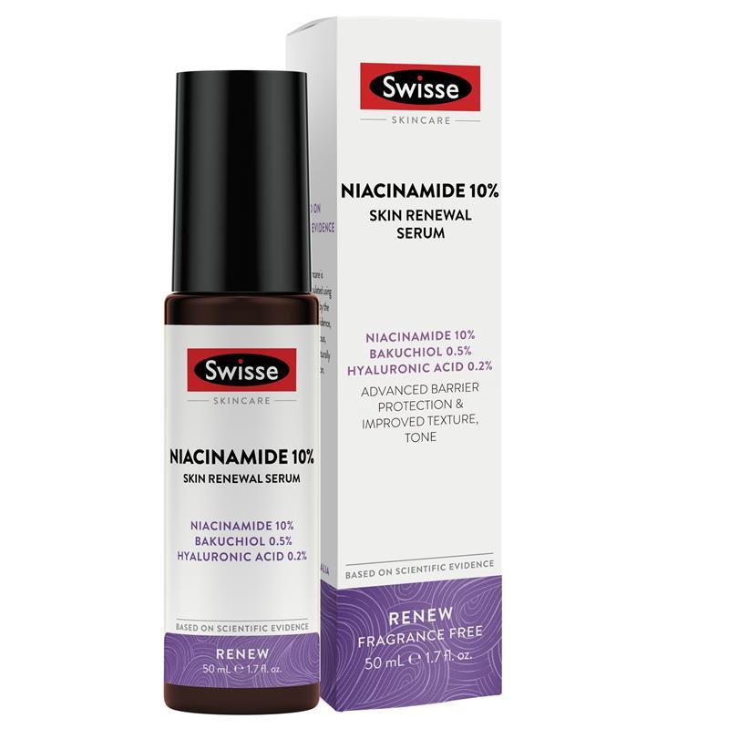 Support your skin's radiance with Swisse Skincare Niacinamide 10% Skin Renewal Serum. It contains niacinamide to reduce the appearance of dark spots and enhance smoothness while bakuchiol reduces the appearance of fine lines for a smoother complexion. A must-have for vegan and vegetarian skincare enthusiasts.