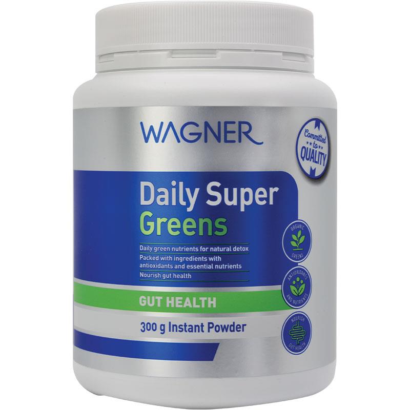 Wagner Daily Super Greens supports gut health via the use of barley grass, wheatgrass, and spirulina, which contain insoluble and soluble dietary fibre.