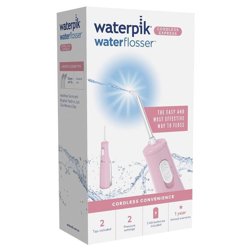 Boxed Contents: Waterpik Cordless Express Pink, includes 3 AA batteries and 2 Classic Jet Tips.