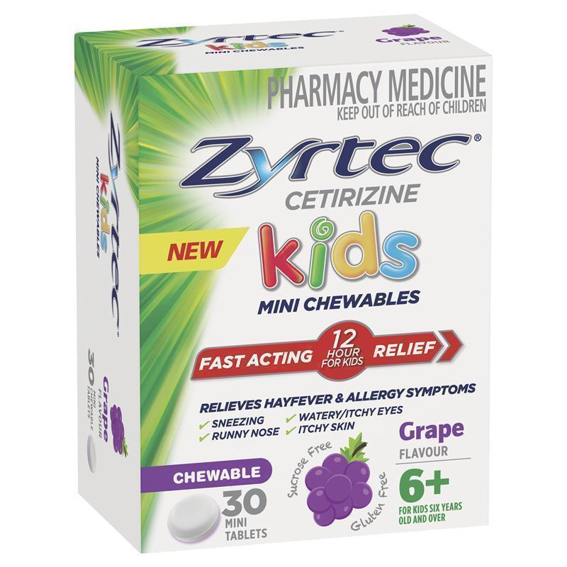 Zyrtec® Kids Allergy & Hayfever Antihistamine Chewable Tablets Grape flavour provide fast acting 12 hour relief from the symptoms of hayfever & allergies for children aged 6+.